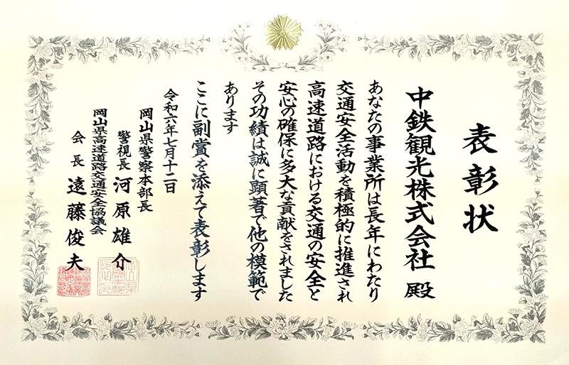 ・令和6年7月、高速道路における長年の安全運行への取り組みが評価され、「岡山県高速道路交通安全協議会」様より表彰されました。